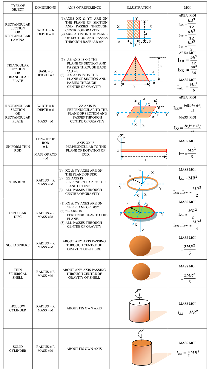 विभिन्न अक्षों में सरल ज्यामितीय आकृतियों वाली वस्तुओं के लिए जड़त्व आघूर्ण की एक तुलनात्मक सूची नीचे दी गई है, ताकि समान वस्तुओं के बीच जड़त्व आघूर्ण मूल्यों की तुलना को अलग किया जा सके और उपयोग के समय आसानी से याद किया जा सके।