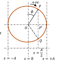 - परन्तु, कण घनात्मक ( x ) दिशा में आगे बढ़ रहा है। इसका तात्पर्य हुआ कि कण \left ( x = \frac {A}{2} \right ) से ( x = + A ) की दिशा में बढ़ रहा है।